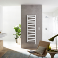 Like a steel band that wraps around the bathroom radiator, Zehnder Kazeane impresses with its modern design and practicality. Its oblique rungs are inspired by architectural structures with multiple levels. Large spaces provide the whole family with plenty of room to hang several towels. This linking of form and function transforms Zehnder Kazeane into a radiator that invites comfort and class into the bathroom. Available in any colour and finish from the Zehnder colour chart.