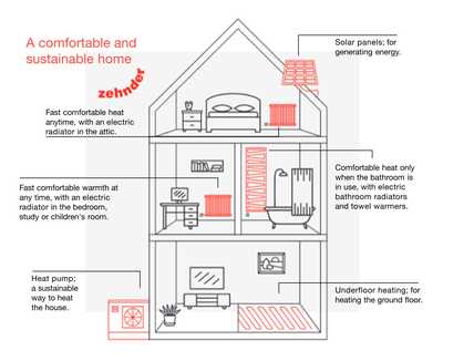 A plug-in radiator is fully electric and extremely suitable for new construction and renovation with solar panels. In a home today, the heat pump provides hot water, and the underfloor heating provides comfortable heat on the ground floor. In the bedroom and in the bathroom, the plug-in radiator provides quick and comfortable heat especially in the transitional seasons spring, and fall. Solar panels for energy generation make electric heating a sustainable heating solution.